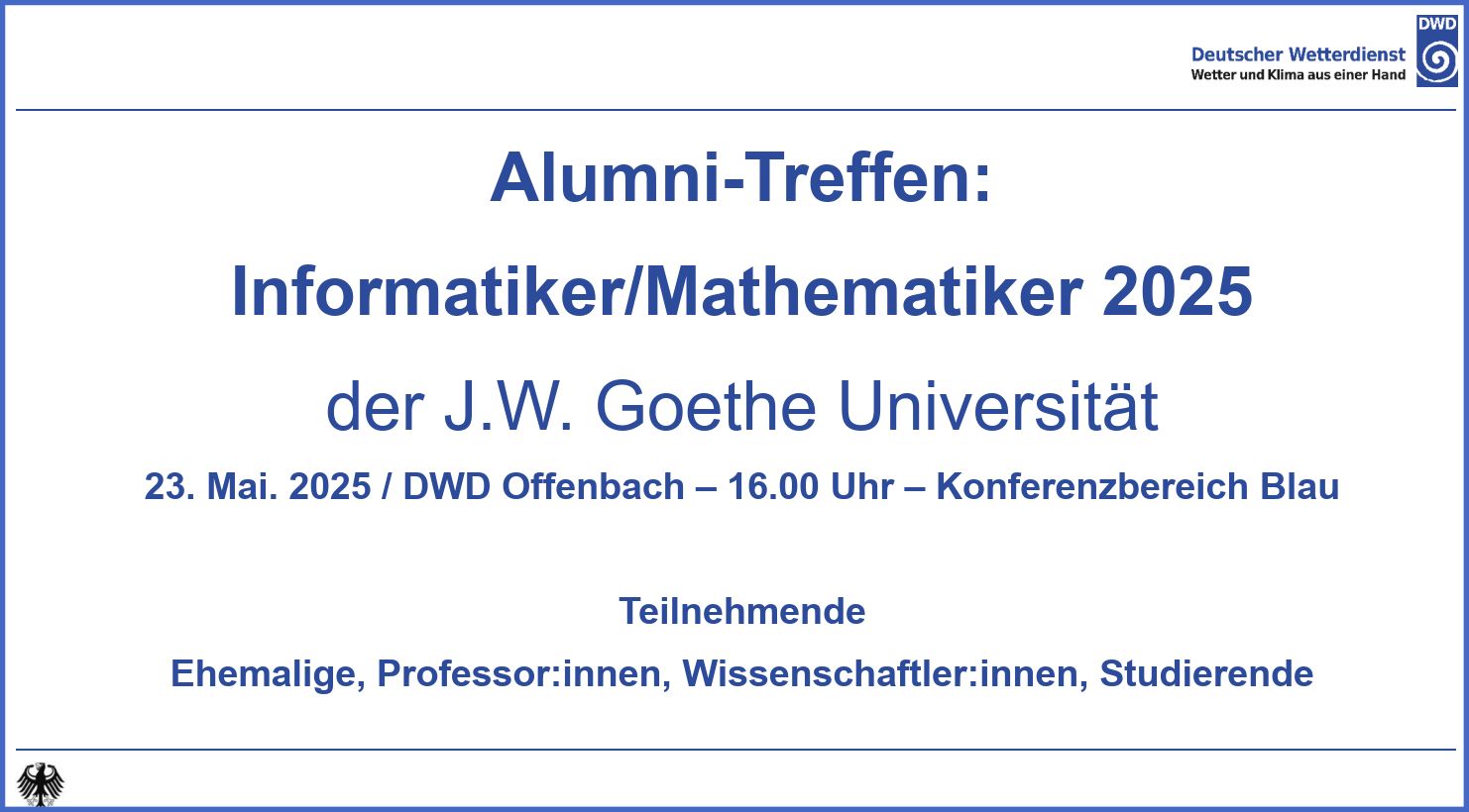 Herr Leander Jamin – Vorstand Geschäftsbereich Personal- und Betriebswirtschaft – berichtete unter dem Titel „DWD Wetter und Klima aus einer Hand“ über das weltweite Aufgabengebiet des Wetterdienstes in Offenbach.Ausflug der Frankfurter Informatik und Mathematik im Mai 2025