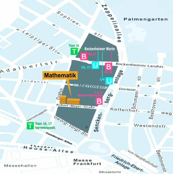 Take underground line U4 direction "Bockenheimer Warte" and get off at the final station "Bockenheimer Warte".