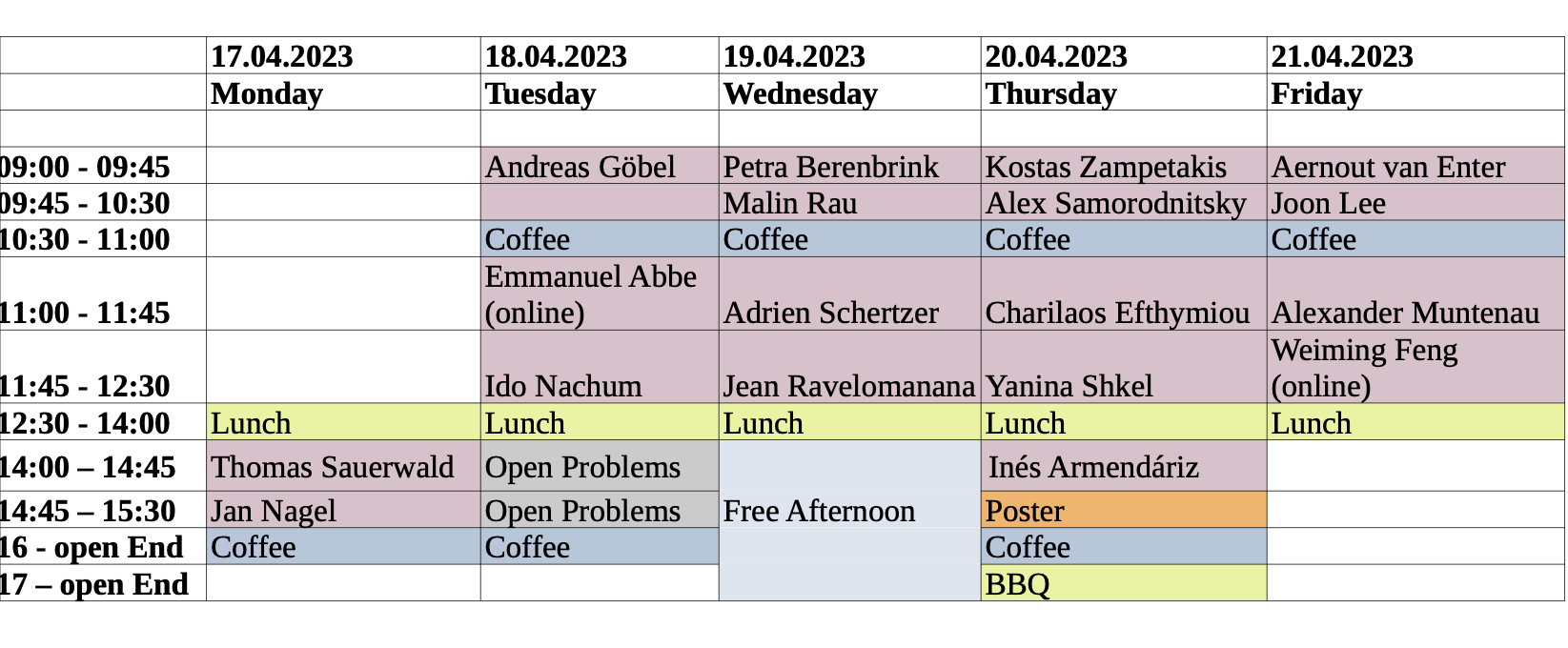 The workshop will start with Lunch at 12:30 pm on Monday and will conclude after Lunch on Friday at 14:00 pm.