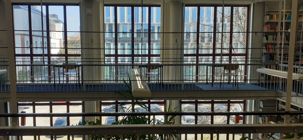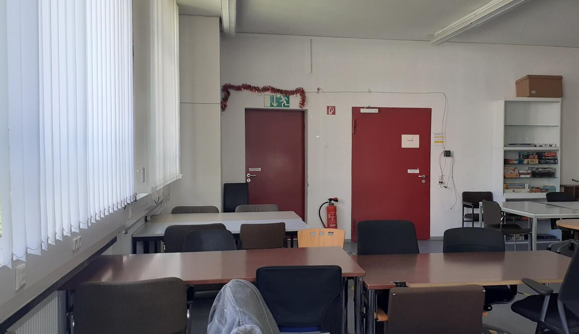 Im alten Lernzentrum stehen Tische und Stühle bereit. Hier gibt es Strom und W-Lan (eduroam), sowie Kontakt zu Mitstudierenden. Eine Tafel und eine Pinnwand mit Infos und Gesuchen ergänzen den gut beleuchteten Raum. Hier ist auch der Zugang zum Kopiererraum (HRZ).