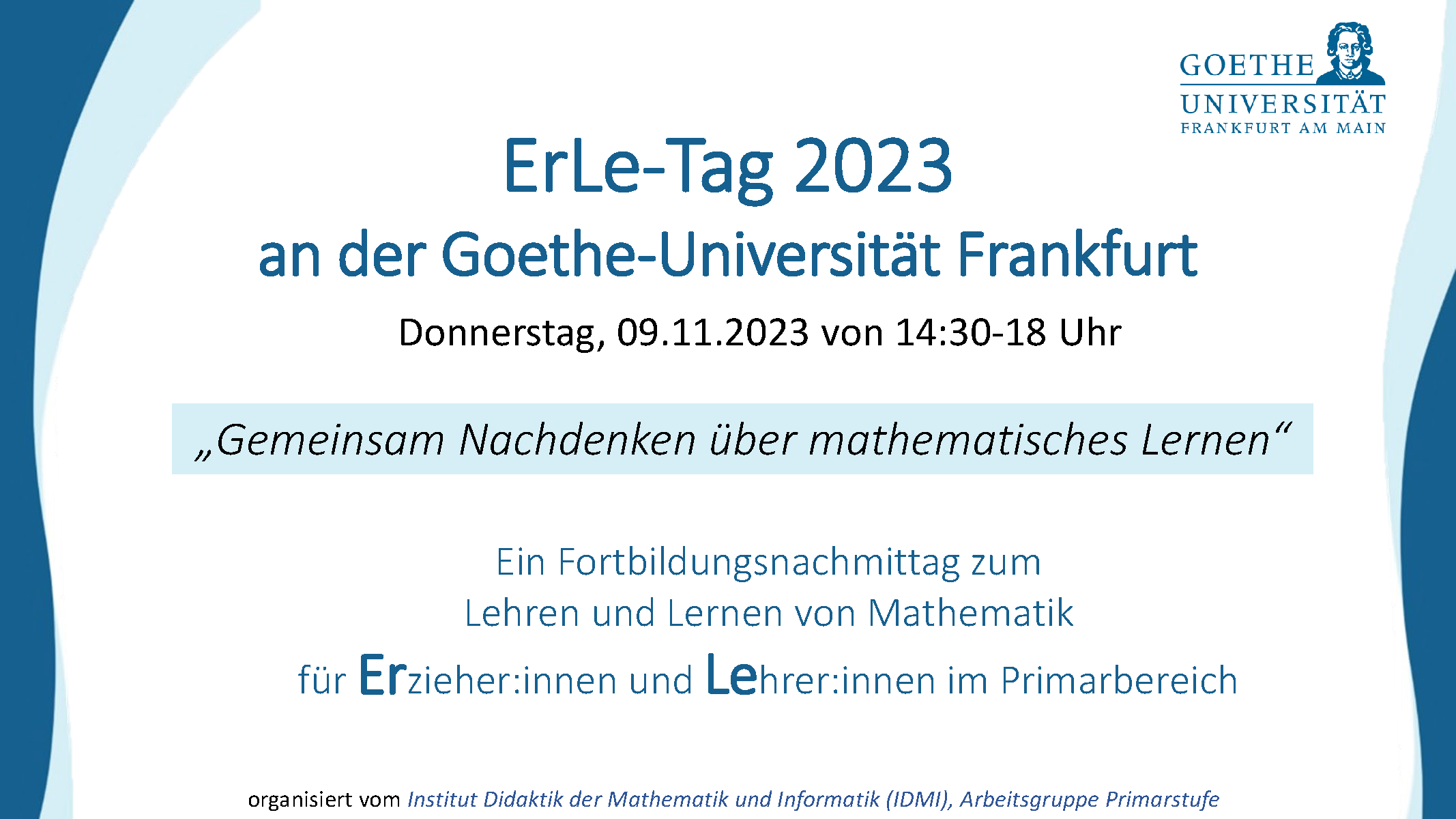 hiermit laden wir Sie ganz herzlich zum diesjährigen ErLe-Fortbildungsnachmittag mit dem Motto "Gemeinsam Nachdenken über Mathematik" ein. Er findet am Donnerstag, den 09.11.23 (nachmittags) an der Goethe-Universität Frankfurt im Institut für Didaktik der Mathematik (Primarstufe) statt.