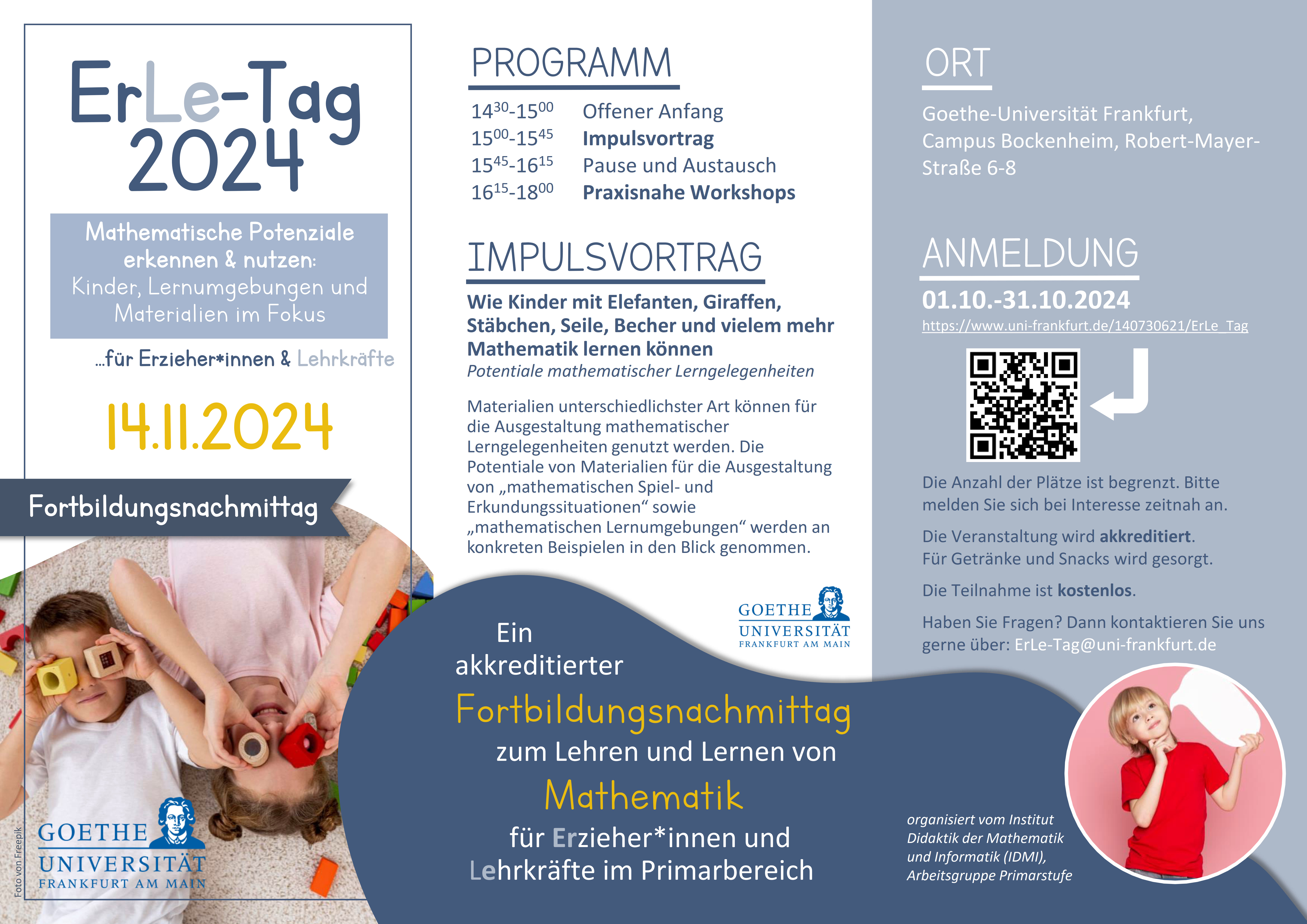 hiermit laden wir Sie ganz herzlich zum diesjährigen ErLe-Fortbildungsnachmittag mit dem Motto "Mathematische Potenziale erkennen & nutzen: Kinder, Lernumgebungen und Materialien im Fokus" ein. Er findet am Donnerstag, den 14.11.24 von 14:30 bis 18:00 Uhr an der Goethe-Universität Frankfurt im Institut für Didaktik der Mathematik (Primarstufe) statt.