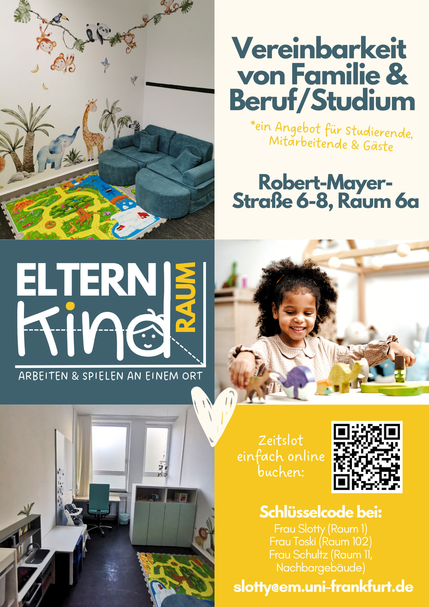 Der Eltern-Kind-Raum ist mit einem Wickeltisch ausgestattet, um den Bedürfnissen der Kleinsten gerecht zu werden. Für die Zubereitung von Fläschchen oder dem Aufwärmen von anderem Essen kann die benachbarte Teeküche mitgenutzt werden. Der Raum ist mit einem Arbeitsplatz für Eltern versehen, der ihnen die Möglichkeit bietet, ihre Studien- oder Arbeitsaufgaben zu erledigen, während ihre Kinder in der Nähe spielen. Für Kinder, die eine Pause benötigen, gibt es eine Ruhe- und Rückzugsmöglichkeit, in der sie ungestört schlafen können. Außerdem gibt es eine bunte Auswahl an Kinderbüchern, eine Mini-Küche, ein gemütliches Spielsofa und altersgerechtes Spielzeug für Kinder im Alter von 0 bis 8 Jahren. Der Raum schafft somit eine Balance zwischen Arbeits- und Spielumgebung und unterstützt Eltern dabei, Studium, Beruf und Kinderbetreuung in Einklang zu bringen.