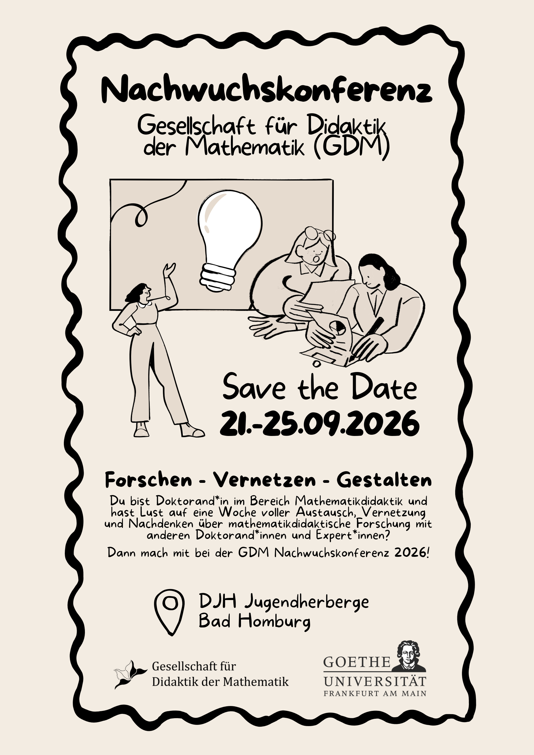 Die Nachwuchskonferenz richtet sich an Personen, die neu im Bereich der Didaktik der Mathematik sind. Das umfasst Promovierende, die bereits ein grobes Promotionsvorhaben haben bzw. bereits über die Orientierungsphase (ca. das erste halbe Jahr) ihrer Promotion hinaus sind. Das umfasst aber auch Post-Docs, die bspw. aus angrenzenden Disziplinen wie Mathematik oder den Bildungswissenschaften in die Didaktik der Mathematik gewechselt sind.